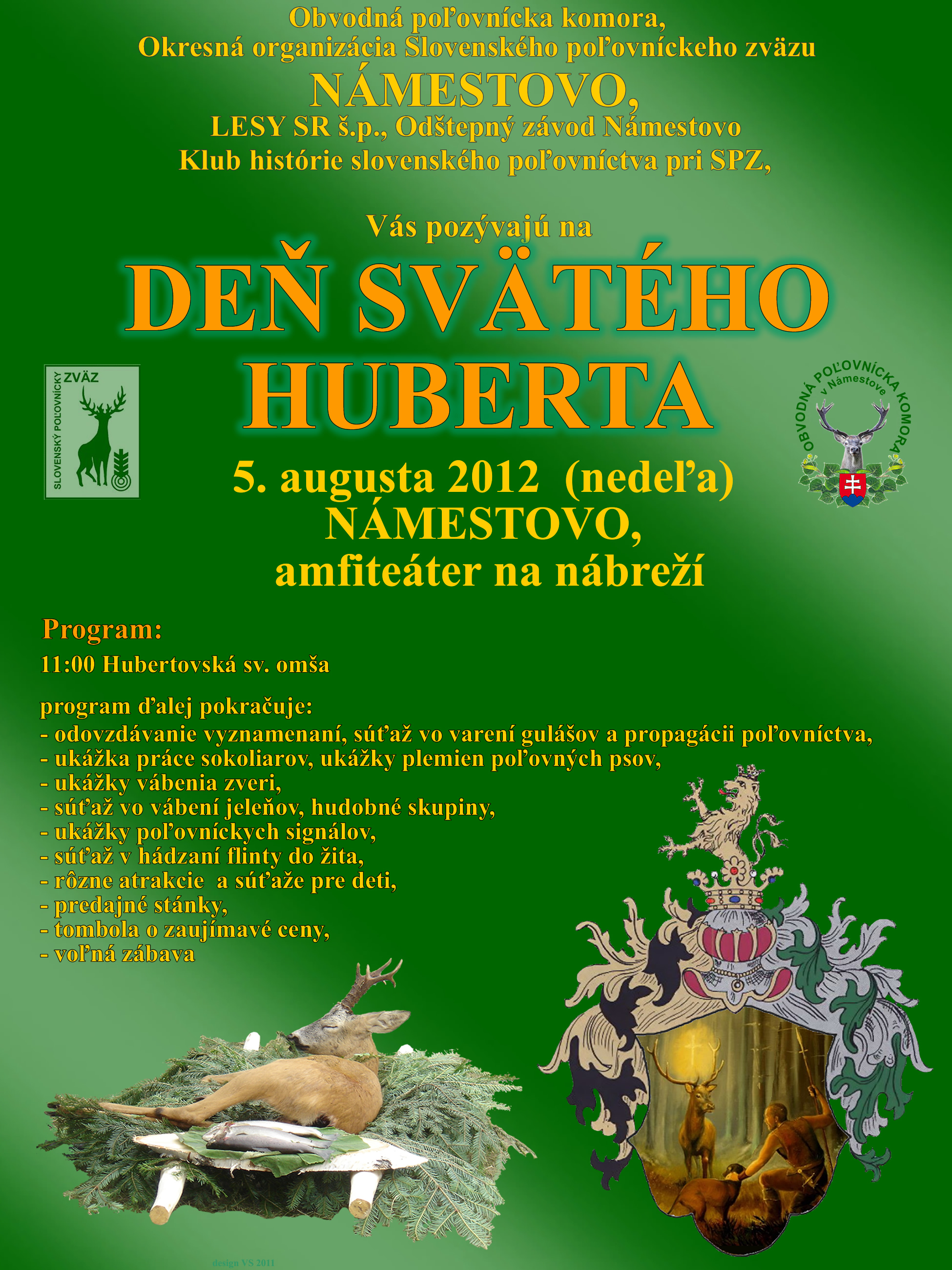 Program: 10.00 h - divadelné predstavenie pre deti 11.00 h - Sv.Hubertská omša 12.00 h - slávnostné otvorenie 13.00 h - výcvik poľovníckych psov 14.30 h - vystúpenie sokoliarov 16.30 h - žrebovanie tomboly
