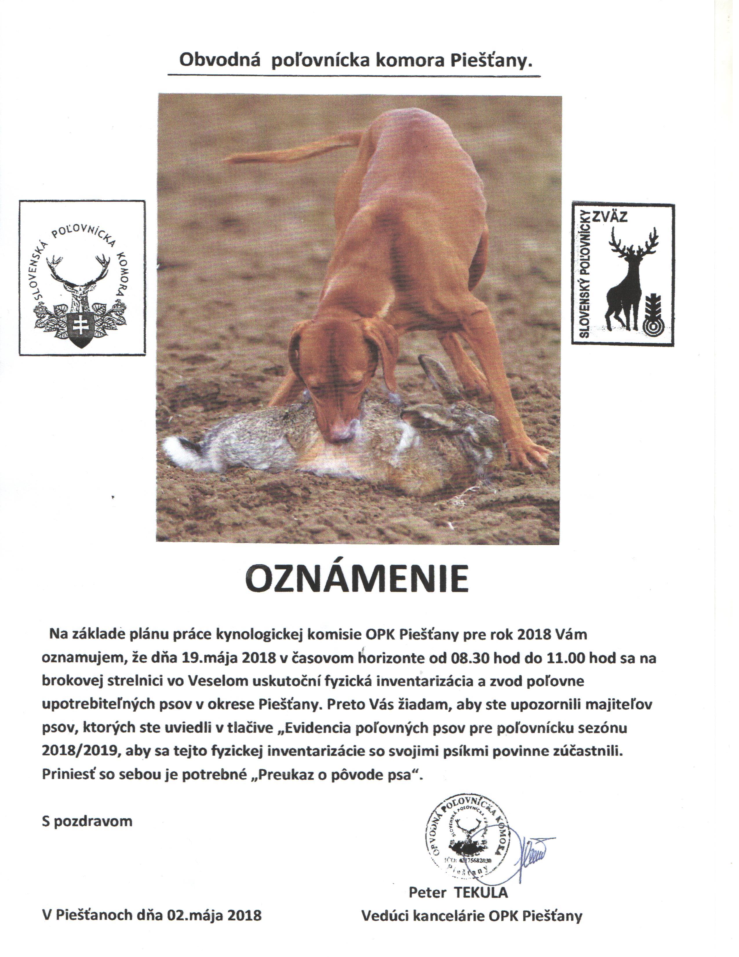 Pre všetkých hospodárov poľovných združení v okrese Piešťany. Dňa 19.5.2018 o 8,00hod. vo Veselom sa uskutoční evidencia poľovne upotrebiteľných psov na sezónu 2018/2019.